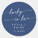 Este boho chic royal, sortudo em amor por um adesivo redondo clássico é perfeito para um casamento minimalista. O ousado design boêmico azul escuro e moderno apresenta uma caligrafia rústica simples com um estilo único, mas clássico. Personalize seus adesivos de favor com seus nomes e data de casamento.