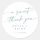 Este boho chic teal e branco um doce obrigado que você prefere um adesivo redondo clássico é perfeito para um casamento minimalista. A design boêmica azul-verde e branca apresenta uma caligrafia rústica simples com um estilo único, porém clássico, que lembra a praia costeira e um cruzeiro oceânico de verão. Personalize seus adesivos de favor com seus nomes e data de casamento.