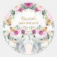 Um adorável adesivo redondo com tema da selva, com dois bebês elefantes doces e folhas tropicais de cor aquosa e arranjo floral em pincel, violeta, verde e ouro. Itens correspondentes disponíveis em nossa loja!