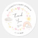 Obrigado de chá de menina branca, você cola com "Obrigado" em um roteiro na moda e cores-d'água cor-de-rosa e amarelas inspiradas em ventre de um arco-íris, sol, corações, estrelas, luas e nuvens. Personalize com o nome da futura mãe e a data de chá em uma simples tipografia.