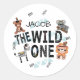 Um boho bonito selvagem, um autocolante de primeiro aniversário. Design com animais de safari selvagem vestidos com elementos boho e roteiro 'selvagem um' com linhas coloridas e escrevendo étnico. Personalize com o nome da criança. Perfeito como um obrigado, você é a favor ou selo de envelope.