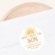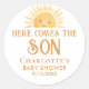 Este adesivo de chá de fraldas com tema solar apresenta o texto "Aqui Vem O Filho" na tipografia de na moda com uma cor amarela e bonita. Facilmente personalizável. Original Watercolor © Michele Davies.