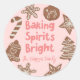 Um adesivo de Natal bonito para padeiros com ilustração desenhada à mão de biscoitos de férias com texto que diz "Espíritos de assar brilhantes". Você pode usar isto como doação de presente ou para sua festa de troca de biscoitos. O fundo é rosa.