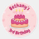 Os adesivos de menina de aniversário personalizaram com o nome deles com um bolo de fosco rosa e três velas para comemorar sua 3.