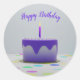 Um bolo roxo de aniversário de desenho animado com glacé coberto por borrifo escorrendo pelas laterais e uma vela acesa se senta sobre uma placa de ouro num balcão coberto de pontos coloridos.