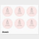 Um adesivo de embalagem limpo, profissional e moderno para designers de bolos e estilistas de sobremesas. Este design apresenta uma imagem caprichosa desenhada à mão de um bolo de três andares em cinza e detalhes comerciais em cinza escuro, contra um fundo rosa suave.