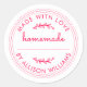 Adesivo de enlatamento de produtos assados caseiros ou geléia rústico, moderno e simples com o texto caseiro, feito com amor e seu nome em caligrafia manuscrita estilosa cor-de-rosa vibrante e tipografia em um fundo branco. Basta adicionar seu nome ao rótulo. Escreva os nomes dos produtos nos adesivos quando seus produtos estiverem prontos. Exclusivamente projetado para você pelo Happy Dolphin Studio!