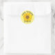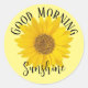 Foto de aproximação de um girassol amarelo brilhante com texto "Bom dia, sol-sol" sobre fundo amarelo-claro. Se quiser, substitua a palavra Sunshine por um nome ou outro texto.