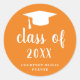 Um adesivo de graduação minimalista com um design simples e clássico com um boné de formando e uma "classe de ano" em uma escrita grossa com o nome do formando em branco sobre um fundo laranja. A cor de fundo pode ser alterada para qualquer cor que você desejar. Um estilo tradicional com um talento moderno perfeito para um formando feminino. Estes autocolantes são excelentes como selos de envelopes ou para favoritos para festas.