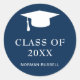 Os adesivos de graduação modernos apresentam um design simples e masculino com "Classe de Ano" em letras grandes e negrito juntamente com um boné de formando e o nome do formando em branco sobre um fundo azul de marinho. A cor de fundo pode ser alterada para corresponder à cor da sua escola. Estes adesivos são perfeitos para um formando de cara e são excelentes como selos de envelopes ou para favoritos para festas.