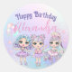 Este bonitinho adesivo de festas de aniversário apresenta um tema de bonecas de moda. Três bonecas com cabelo colorido e roupas bonitinhas são colocadas no fundo. Uma boneca está segurando balões e estrelas cor-de-rosa são colocadas ao seu redor. São colocadas estrelas Douradas de brilho ao longo das porções inferior e superior. O fundo é um padrão iridescente do arco-íris. Um exemplo de mensagem "Parabéns" é impresso no topo em uma fonte roxa e caprichosa. Um nome de exemplo é impresso abaixo em uma fonte de script rosa. Você pode personalizar os adesivos para incluir seu próprio nome personalizado ou outro texto.