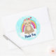 Um desenho animado de uma preguiça meditante. Vestindo uma coroa de flores silvestres em sua cabeça, flutuando pacificamente em uma nuvem branca com um arco-íris colorido atrás. Um casal de corações perto. Pacífico e feliz. Um fundo de estilo azul-claro. O texto diz: "Obrigado". O texto pode ser editado ou excluído.