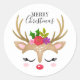 Um rosto bonito de rena decora este adesivo com as palavras Feliz Natal. Divertido por decorar presentes de Natal e bolsas de Natal para vizinhos. Projetado para você pelo boulevard Blackberry.