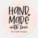 Bonito e elegante, o melhor dos dois mundos! A design de "Mão Feita com Amor" com um coração simples num lindo fundo cor-de-rosa é o acessório perfeito para os seus pacotes de pequenas empresas! Adicione o nome da sua empresa, mensagem especial, código de cupom, identificador de Instagram ou URL do site à parte inferior para obter um adesivo de embalagem verdadeiramente personalizado! Altere a cor de fundo para corresponder à marca da sua empresa! Uma maneira divertida e notável de os proprietários de pequenas empresas e os fornecedores independentes serem notados, aumentar as vendas e obter mais revisões.