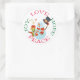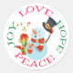 Este é um adesivo bonito para uso versátil durante a temporada de Férias. Ele apresenta uma imagem de desenho animado de um pequeno boneco de neve levantando seu chapéu e cantando seu coração. Ao seu lado está uma pilha de presentes de Natal brilhantemente enrolados. A imagem é cercada pelo texto Love Hope Peace Joy em vermelho e verde.