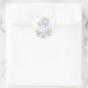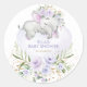 Este adorável adesivo redondo apresenta rosas roxas elegantes, verde botânico suave em verde e ouro, e um adorável elefante bebê adormecido deitado num balão bonito em forma de coração. Clique no botão "personalizar mais" se quiser reorganizar e formatar o estilo e a posição do texto.