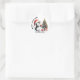 Crie adesivos de Natal brancos e vermelhos personalizados e na moda para enviar selos, favores ou brindes com um design que diz "Feliz Natal" e apresenta um pinguim bonito em um Papai Noel vermelho que decora uma árvore de Natal. O modelo torna fácil digitar seu nome de família.