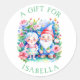 Etiquetas personalizadas com um gnomos bonitinho entre o Sr. e a Sra. Clause cercados por flores.