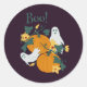 Uma ilustração divertida do Dia das Bruxas cheia de fantasmas amigáveis, abóboras e vinhas florescentes. Uma mistura divertida de esquisitice e botânica em um estilo limpo e vintage.