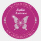 Personalize este adesivo de endereço de devolução de borboleta diamante com seu nome e endereço em fundo deep fuchsia e um círculo cinza com texto cinza.