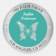 Personalize este adesivo de endereço de devolução de borboleta diamante com seu nome e endereço em texto preto e branco em metal prateado com fundo de círculo verde. Clique em “Personalizar” para alterar cores e estilos de texto.