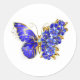 Borboleta de flores cinza, azul, safira, espumante com asa decorada com flores preciosos azuis com folhas de ouro sobre fundo branco.