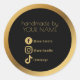 Envie correspondências e embrulhos de presente com um rótulo redondo moderno que destaca uma linha de produção artesanal, escrita elegante e espaço para links de redes sociais para aumentar os seguidores após cada pedido da loja Etsy. O centro preto ousado e o anel com efeito dourado luxuoso criam um alto contraste para embalagens de pequenas empresas e rotulagem de produtos, com áreas claras para nomes de contas do Facebook, Instagram e TikTok. A personalização é totalmente suportada. Atualize o nome, a mensagem e os ícones para combinar com o estilo da marca. O efeito dourado é impresso.