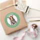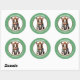 Uma imagem de um adorável cão de Boston Terrier vestindo um suéter de inverno e que está no centro deste adesivo de Natal. A imagem é emoldurada numa borda verde circular que contém o texto personalizado em branco. Bonito para cartões de Natal, correspondência e pacotes de presentes.