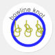 Círculo Azul com um exemplo de três imagens de como amarrar um nó de linha de intestino.