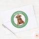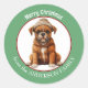 Uma imagem de um adorável cachorrinho do Cachorro Boxer vestindo seu chapéu de inverno e cachecol está no centro desse adesivo de Feriado giro. A imagem é emoldurada numa borda verde circular que contém o texto personalizado em branco. Perfeito para cartões de Natal, correspondência e pacotes de presentes.