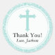 Este adesivo floral, selo ou rótulo azul e branco é adequado para muitas cerimônias religiosas, como o batismo, o batizamento, a dedicação, a Primeira Comunhão Santa ou a confirmação. Começa com um fundo floral azul claro. Tem uma cruz azul, obrigado você e o nome do garoto. Todo texto é facilmente personalizado. Você pode até alterar a fonte ou cor do texto.