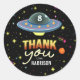 This Out of This World birthday Favor sticker features a neon stars, planets, and a colorful UFO, with retro lettering for the words ‘thank you.’ Personalize with your child’s name and age for a fun space themed kids birthday party favor. Perfect for a 6th, 7th, 8th or 9th birthday, alien party, outer space birthday, or retro galaxy celebration for boys or girls.