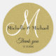 Monogrammed wedding thank you stickers personalised with couple names and wedding date on a classy gold background.