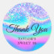 Crie o seu doce 16 festa de aniversário por favor obrigado que você cola. Rapariga esfarelando violeta violeta violeta brilhante brilhando sobre um fundo digital azul, aqua, rosa, magenta e verde iridescente do arco-íris. Personalize os estilos de fonte para criar o seu próprio adesivo design para sua celebração especial. Uma caligrafia elegante clássica emparelhada com uma fonte serif de todos os bonés.