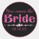 Essas etiquetas de adesivos glamourosas apresentam uma solteira, tema de noiva em um fundo preto. A frase "Aqui vem a noiva" é impressa através do centro, com "Noiva" impressa em uma fonte brilhante rosa-quente. Uma banda luxuosa de diamantes é impressa abaixo dela. Uma data de casamento de exemplo é impressa na parte inferior da qual você pode personalizar para incluir sua própria data ou outro texto personalizado.