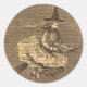 Este adesivo apresenta uma litografia do século XIX de bruxa sentada numa vassoura.