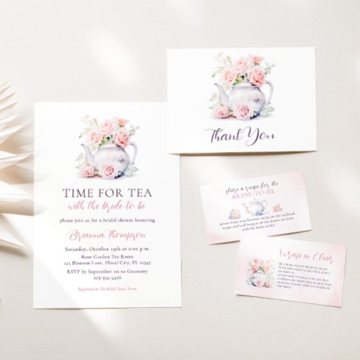 Este design combina lindamente rosas cor-de-rosa com uma ilustração de bule de chá, criando um ambiente elegante e nostálgico para uma festa de chá de noiva.