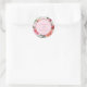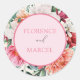 Bonito adesivo de casamento, redondo com fundo rosa e marfim, e uma adorável borda floral.