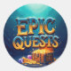 Uma pintura aquosa vibrante com a frase "Epic Quests" em uma escrita artística ousada. As letras são enfeitadas com sotaques de ouro a brilhar e rodeadas por um tesouro cheio de joias e moedas de ouro. O fundo é um fundo azul profundo, reminiscente das profundezas do oceano, acrescentando ao senso de aventura e caça ao tesouro.