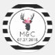Etiquetas de casamento com as iniciais dos casais e a data do casamento. Projetado com uma cabeça de cervo preto feita com linhas geométricas e vestindo uma coroa floral rosa. Design russa e de tendências. Fundo é um padrão com listras brancas e pretas. Personalize com suas iniciais e data do casamento.