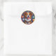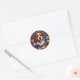 Cachorro alegre com pelo marrom e branco, proeminentemente colocado contra um fundo vibrante do espaço sideral. O cão está centrado em uma moldura circular decorada com planetas coloridos, estrelas e outros elementos celestes. Sua língua está para fora e tem uma expressão feliz, dando-lhe uma personalidade brincalhona. A combinação do cão e do tema cósmico cria uma atmosfera caprichosa e imaginativa. As cores são ousadas e brilhantes, realçando a vibração geral alegre da ilustração.