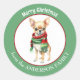 Uma imagem de um adorável cão Chihuahua vestindo um cachecol vermelho e verde de inverno está no centro deste adesivo de Natal. A imagem é emoldurada numa borda verde circular que contém o texto personalizado em branco. Perfeito para cartões de Natal, correspondência e pacotes de presentes.