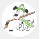 Os adesivos de hóquei são excelentes para os miúdos de hóquei. Cão de hóquei com bastão de hóquei na boca e vestindo um chapéu verde e cachecol