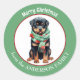 Uma imagem de um adorável cão rottweiler vestindo um lenço vermelho e verde de inverno está no centro deste adesivo de Férias. A imagem é emoldurada numa borda verde circular que contém o texto personalizado em branco. Perfeito para cartões de Natal, correspondência e pacotes de presentes.