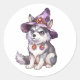 Adesivo Redondo Cachorro Siberiano bonito no Chapéu das Bruxas