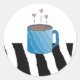 Uma caneca de café a vapor com pequenos corações num fundo de impressão de pelo de zebra.