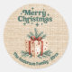 Baivém como fundo, texto verde. Feliz Natal é escrito com uma fonte de estilo retrô. Decorado com uma caixa de presentes com galhos de pínus. Personalize e adicione seu nome de família e um ano. Uma imagem de burlap, não um tecido real.