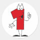 Um grande número vermelho 1 com olhos, braços e pernas em T-shirts de primeiro aniversario Número, canecas, cartões, adesivos, guardas e outros dispositivos de primeiro aniversário.
