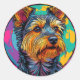 Uma representação artística estilizada de um Yorkshire Terrier com cores arrojadas e vibrantes e um fundo abstrato. Imagem perfeita para mostrar criatividade, temas de animais de estimação e arte digital moderna.