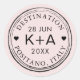 Personalize este design retrô de carimbo de correio aéreo ou passaporte com etiqueta ou selo de envelope com nomes, data de casamento e destino para um toque de tema de viagem! As cores do fundo e do texto podem ser alteradas para combinar com seus convites e decoração.